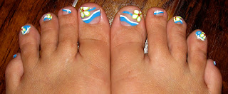 Mia picked glitter pink with dark pink hearts with wings on them. First - have a laugh at how much her toes look like mine (oh yeah, I'm subjecting you to my toes below...), and then realize that the woman painted these hearts with wings on EVERY tiny toenail - She didn't screw up either!